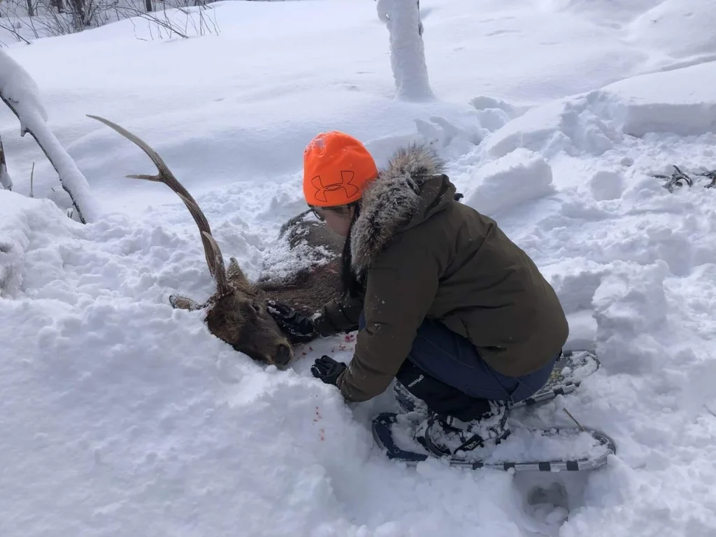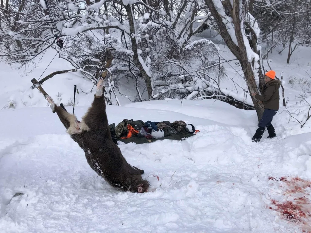 私は鹿を木に吊るす準備を進め、