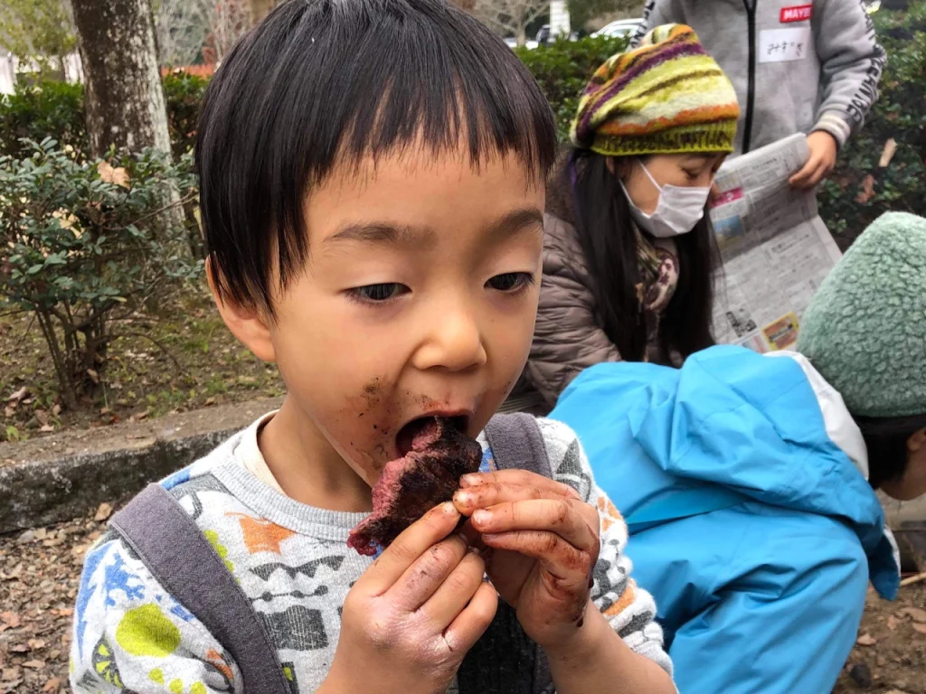 土と炭と血だらけで頬張る。