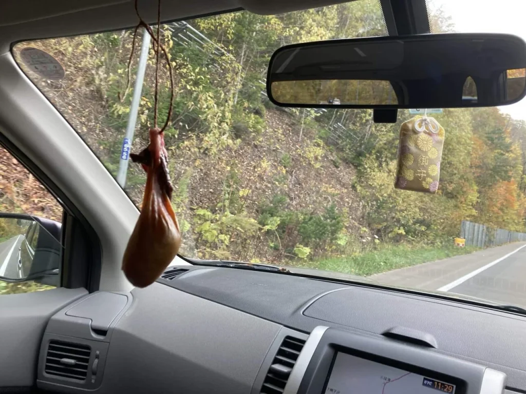 すぐに車に戻りサンバイザーを利用して吊るす。
