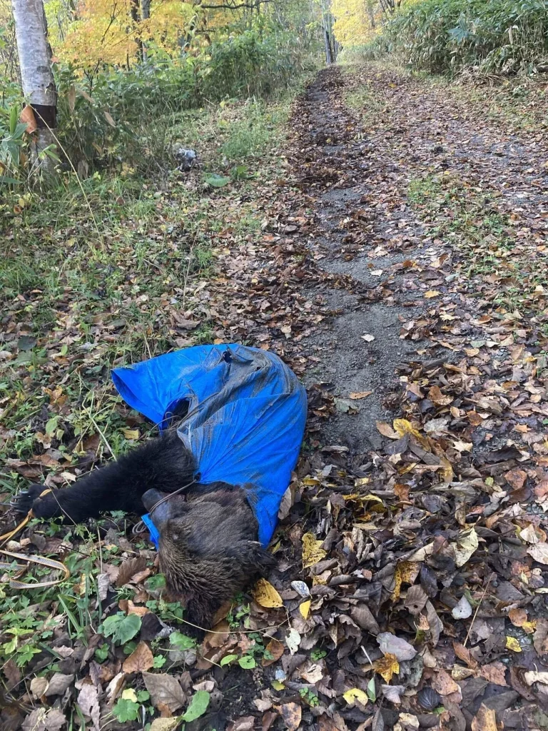 ブルーシートからすぐにクマの体がはみ出てしまい、