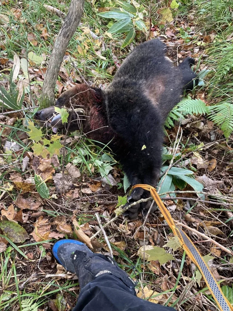 まずは内臓だけを山で出し、少し軽くなったクマを車に乗せ、