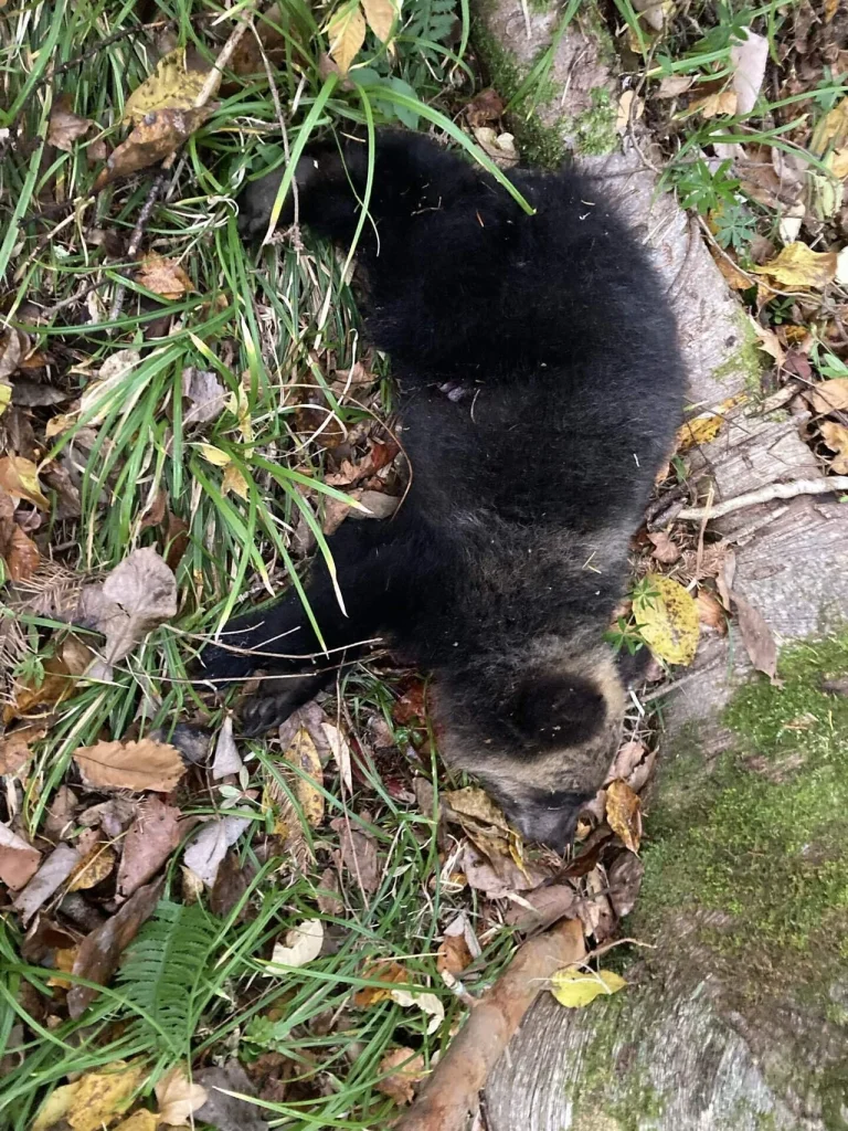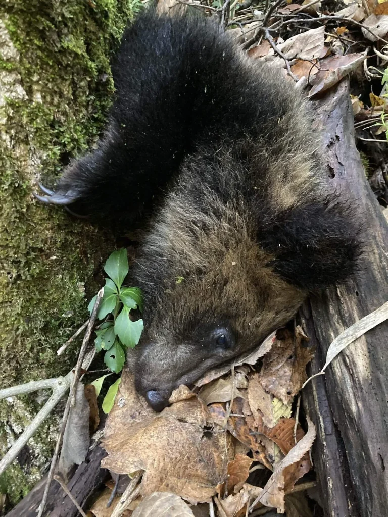 母のそばを離れず私に撃たれた子グマ。