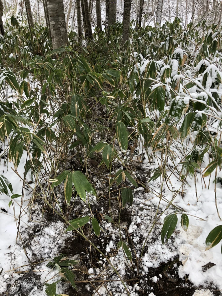 低い笹薮の先のトドマツ林の中。