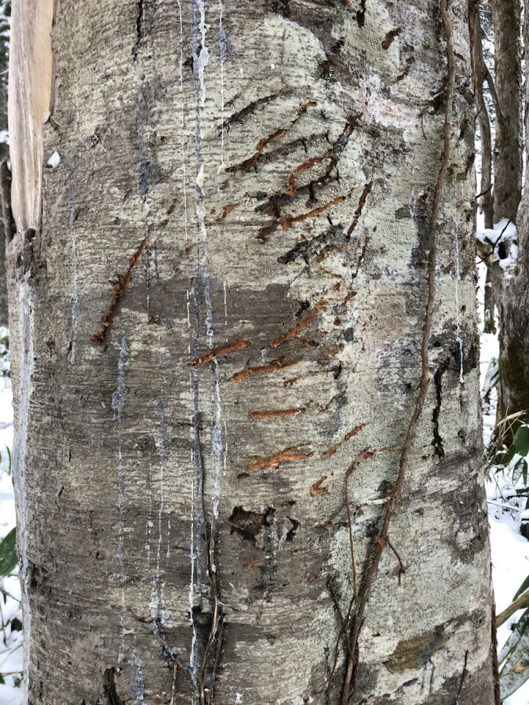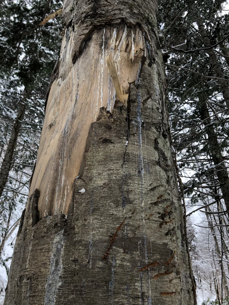 樹皮にはヒグマの縮れた毛が付いている。