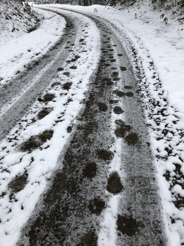 硬くしばれた林道の上、