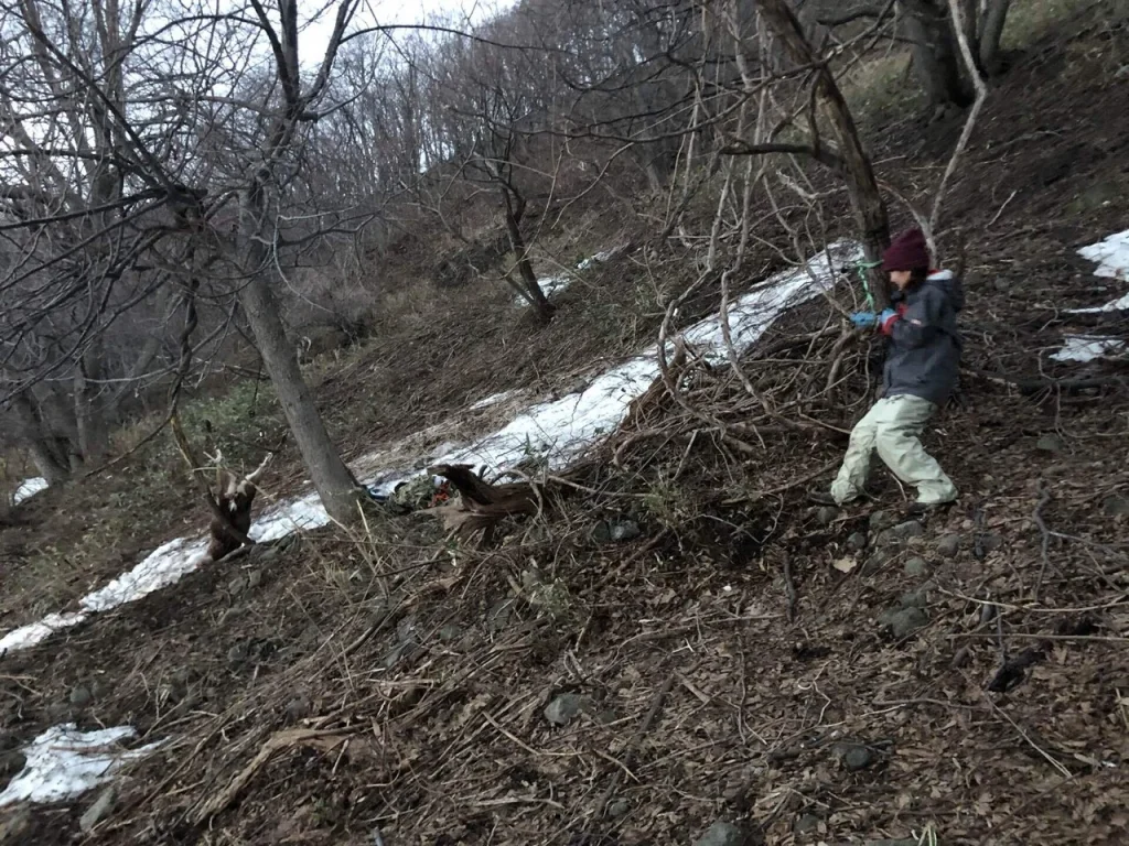 急な斜面を、必死に20メートルほど鹿を引きずる。